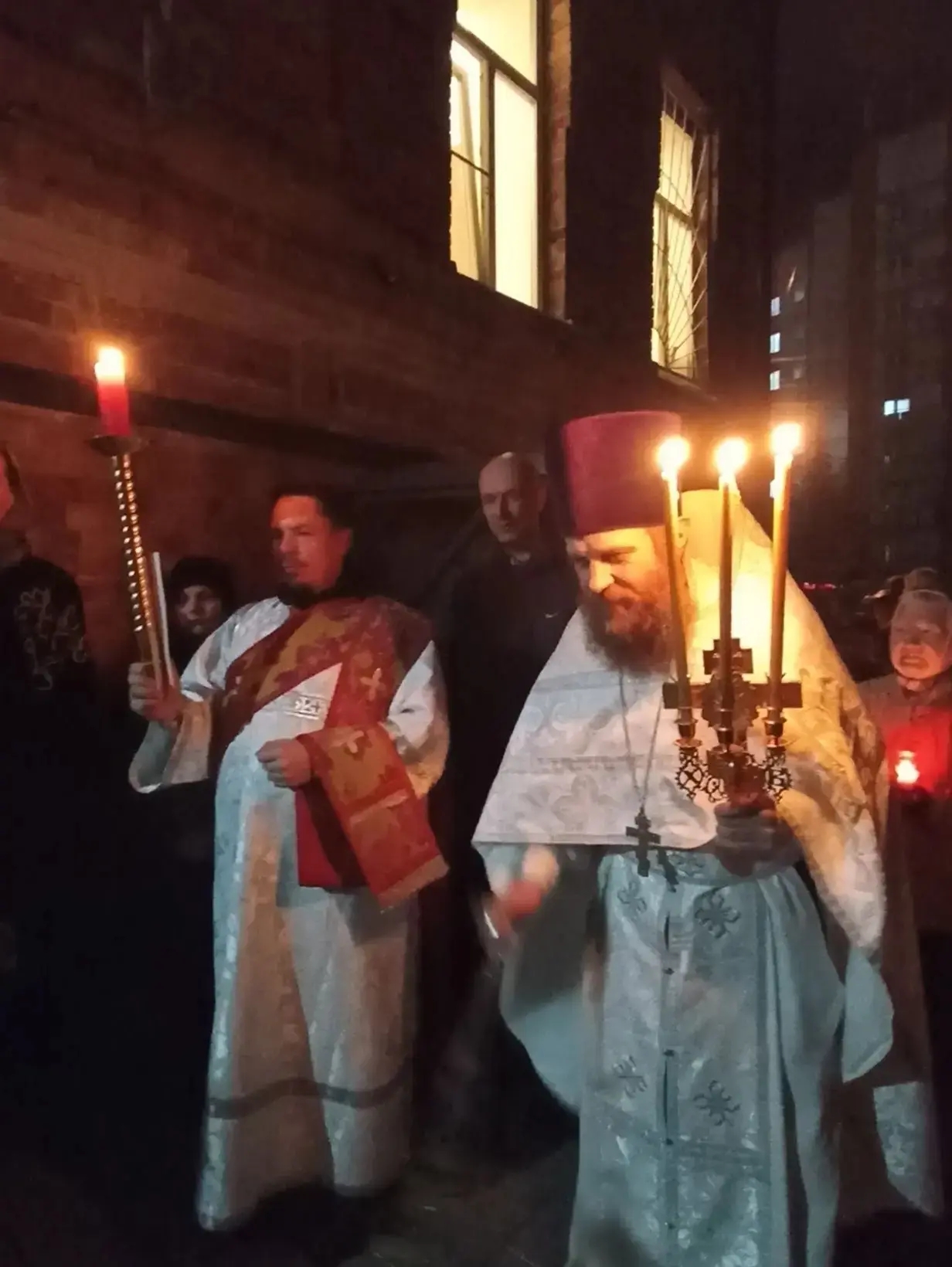 По окончании богослужения настоятель храма иерей Владимир Докин поздравил его участников с Пасхой: «От сердца, исполненного благодарности Богу, возглашаю всем вам великую и спасительную весть: ХРИСТОС ВОСКРЕСЕ!».